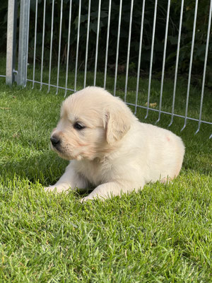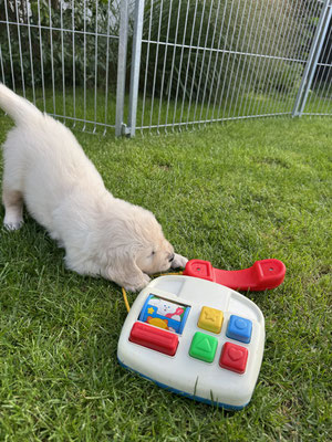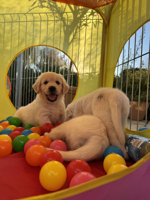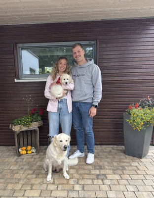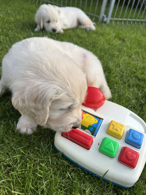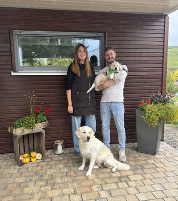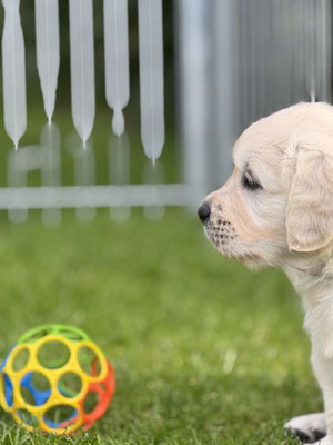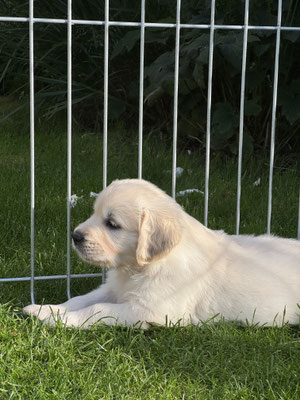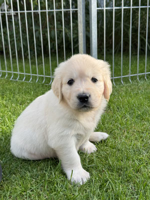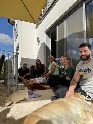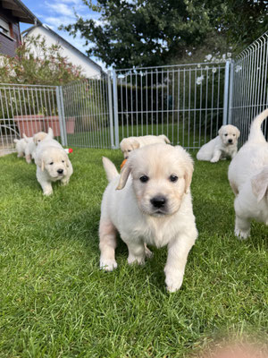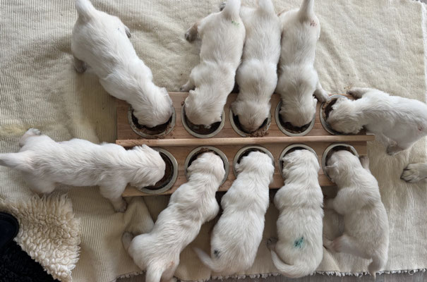 Die Zeit mit den immer größer werdenden Welpen vergeht wie im Flug. Mittlerweile ist das Außengehege eröffnet, und alle freuen sich regelmäßig auf den Garten, in welchem sogar schon fast alle Geschäfte erledigt werden. Der erste Besuch unserer Welpen-Familien brachte allen viel Spaß. Die Vorfreude auf die neuen Familienmitglieder ist groß. Auch der Kostaufbau unseres Hinzufütterns verläuft ohne Komplikationen. Unsere Welpen bekommen sowohl "BARF" als auch Trockenfutter, damit sie beides gewöhnt sind. Wir selber sind vom Barfen überzeugt!