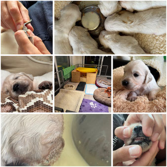 Die Zähne kommen! Die ersten Mahlzeiten werden tapsig verschlungen. Zunächst Welpenmilch, dann leckeres Welpenmousse. Danach hat man schmutzige Welpen, das kann man sich wohl vorstellen...Auch das Krallenschneiden gehört ab jetzt immer mit dazu, schon alleine Mama Aponi zu Liebe, sonst schmerzt es doch sehr beim Säugen.