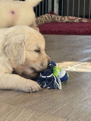 Unsere Dailys verlassen regelmäßig die Wurfkiste. Darum muss auch das Welpengehege immer frisch gemacht und mit Kuschelplätzen versorgt werden. Alle laufen schön.